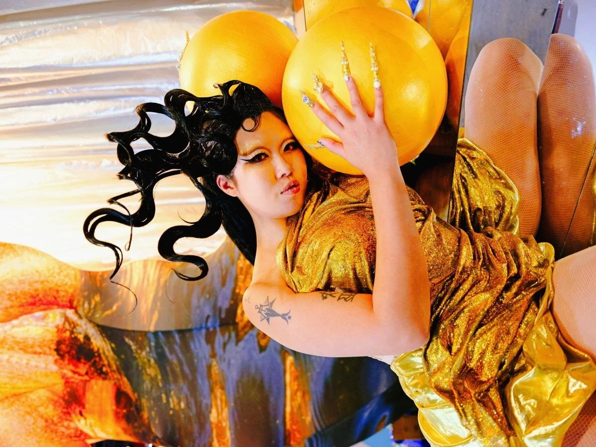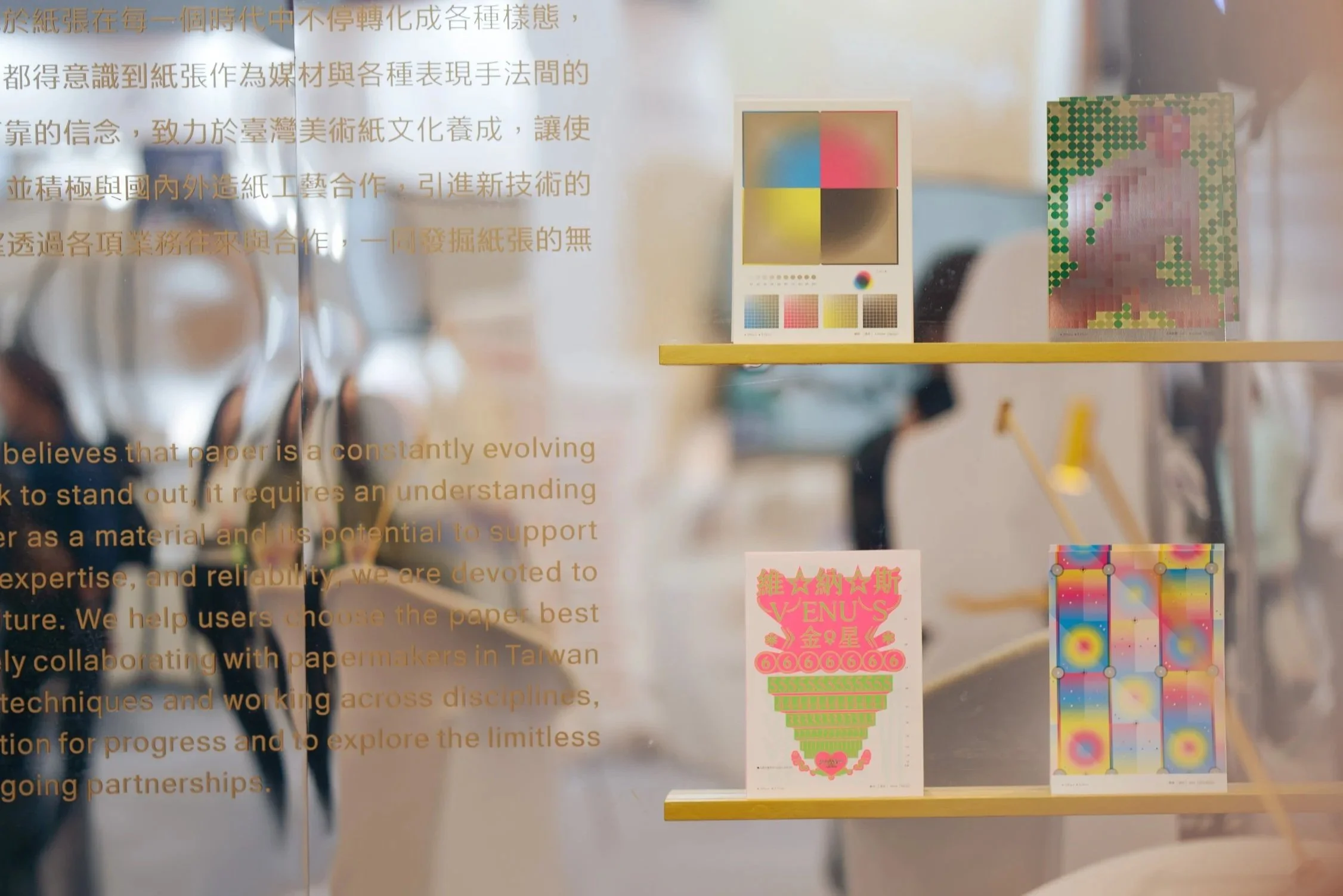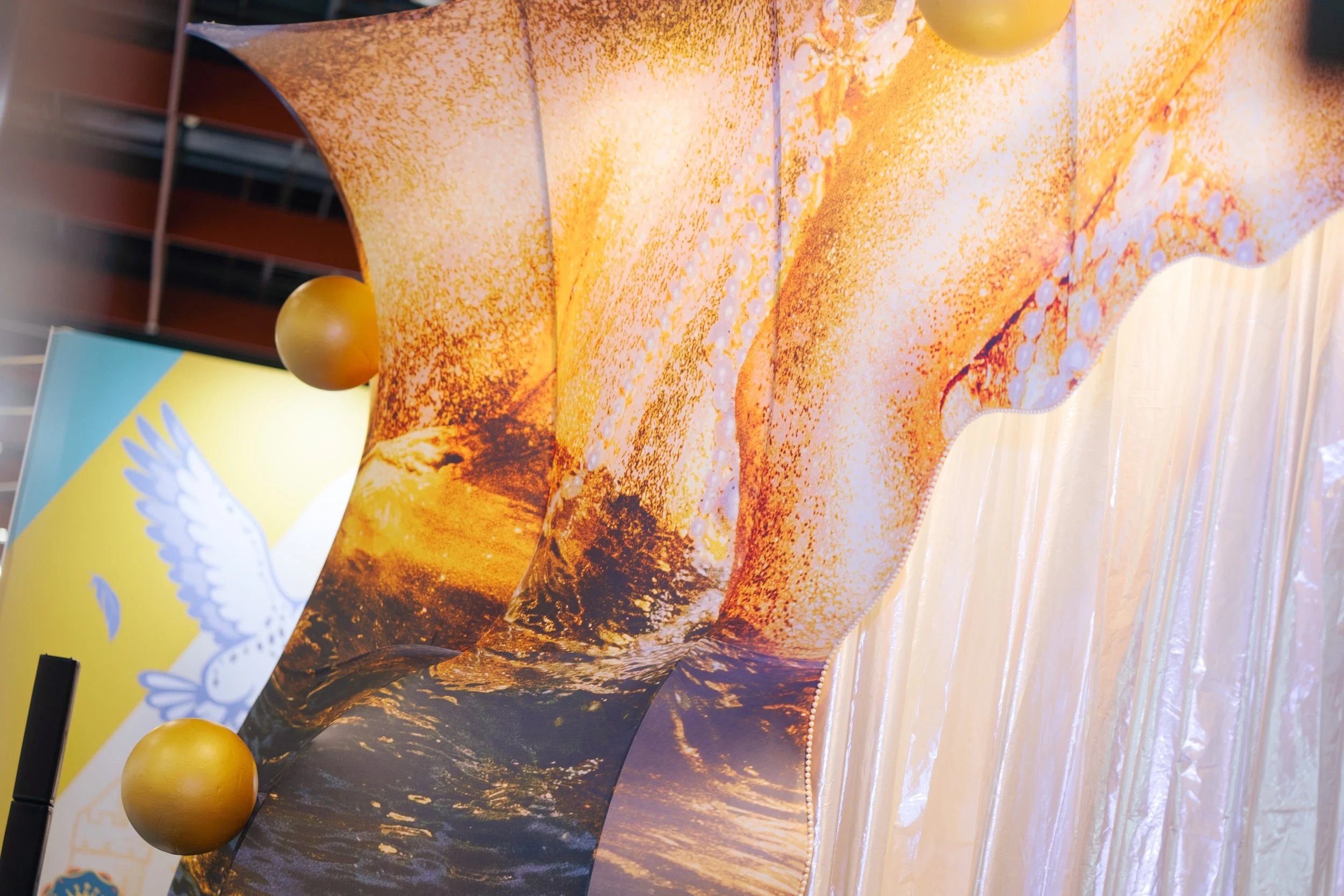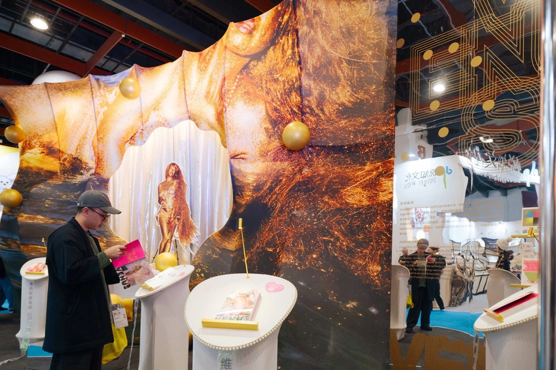 全場以金色為基調,背景牆印刷閃耀的金色女性人體與流動金粉紋理。中央的貝殼形狀開口結合銀色紗簾舞台,搭配前方鏡面階梯與地面散落的霧面金色球體,營造出一種超現實的祭壇感,將紙張發表轉化為一場具備儀式感的體驗。