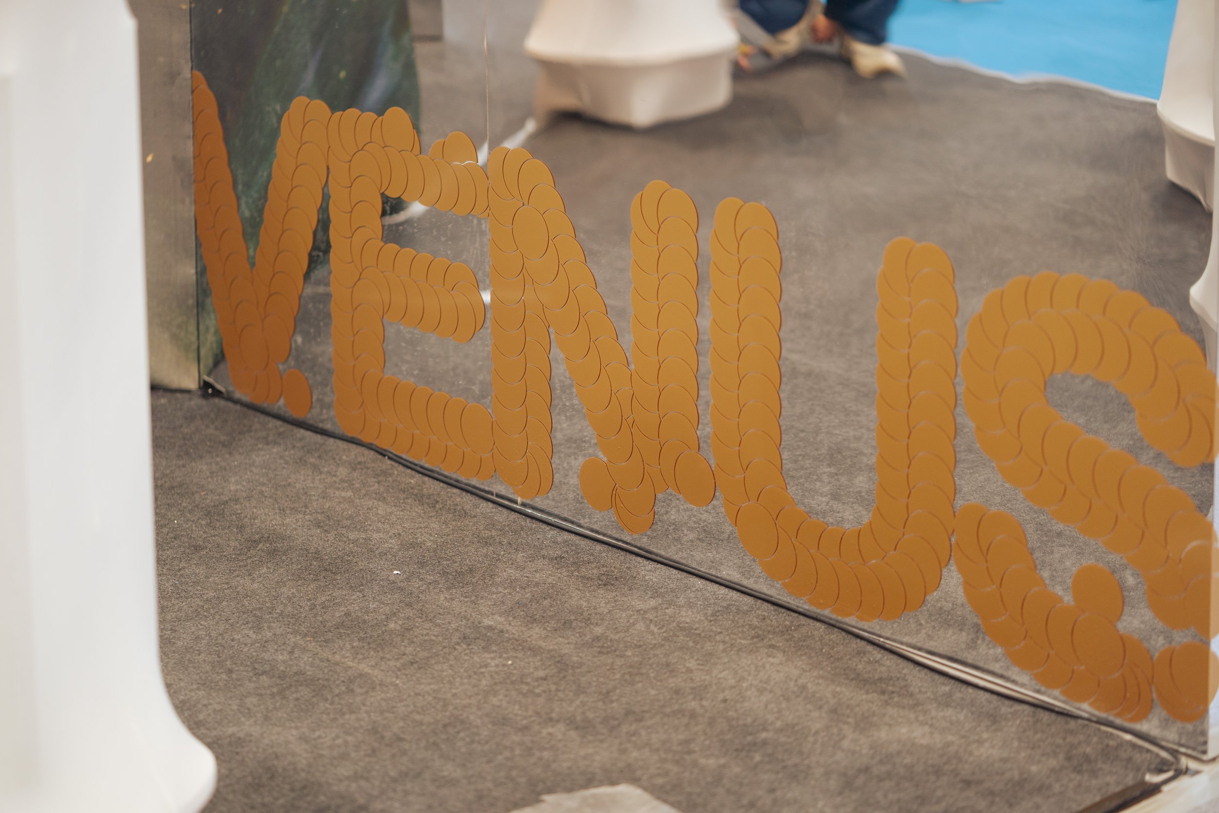 左右兩側白色曲面展示台以「貝柱」的有機形狀勾勒,邊緣鑲嵌珍珠細節。由視覺設計師所設計「VENUS」識別與圓點語彙,在虛實交錯間引導觀者在「動態演繹」與「靜態紙樣翻閱」中,達成感官與資訊傳遞的平衡。