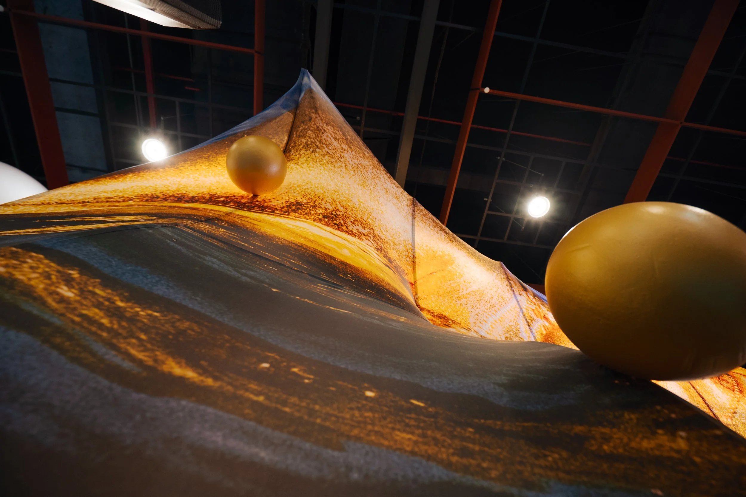 捨棄傳統剛性隔間,罕見地採用高張力彈性布料,構築出巨大的三度空間曲面結構。透過布料的拉伸張力,形塑出包覆感極強的有機貝殼形狀。