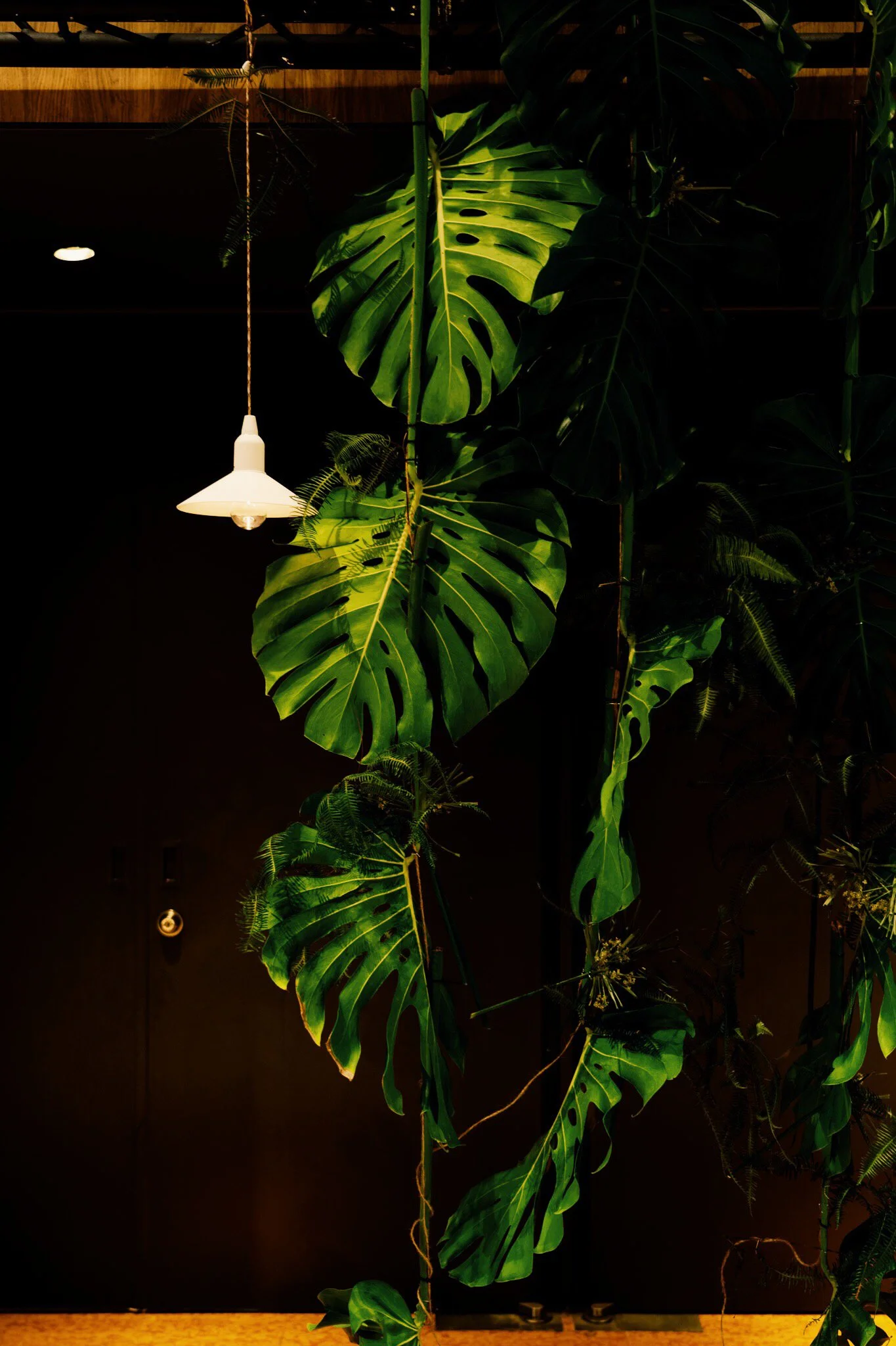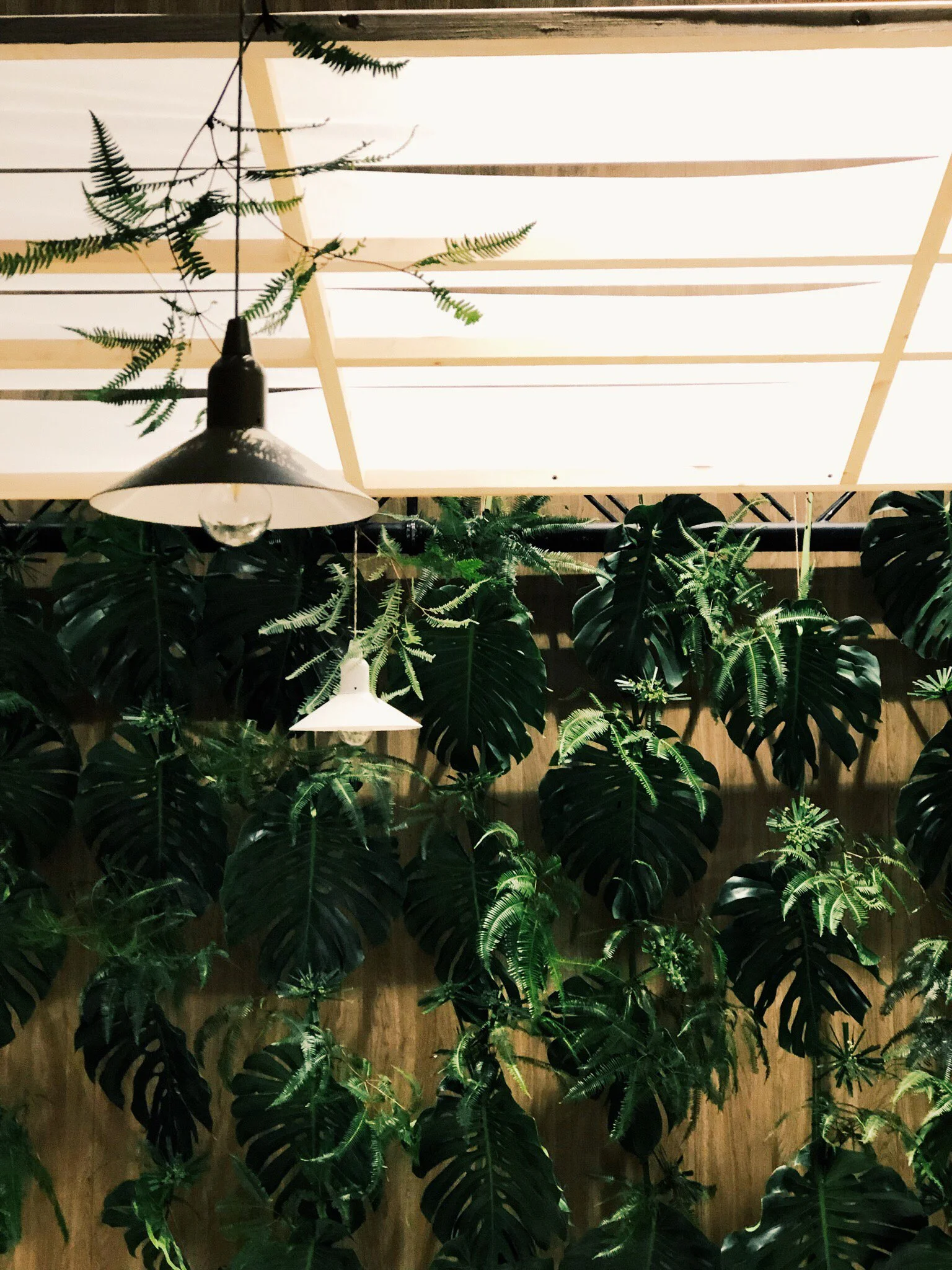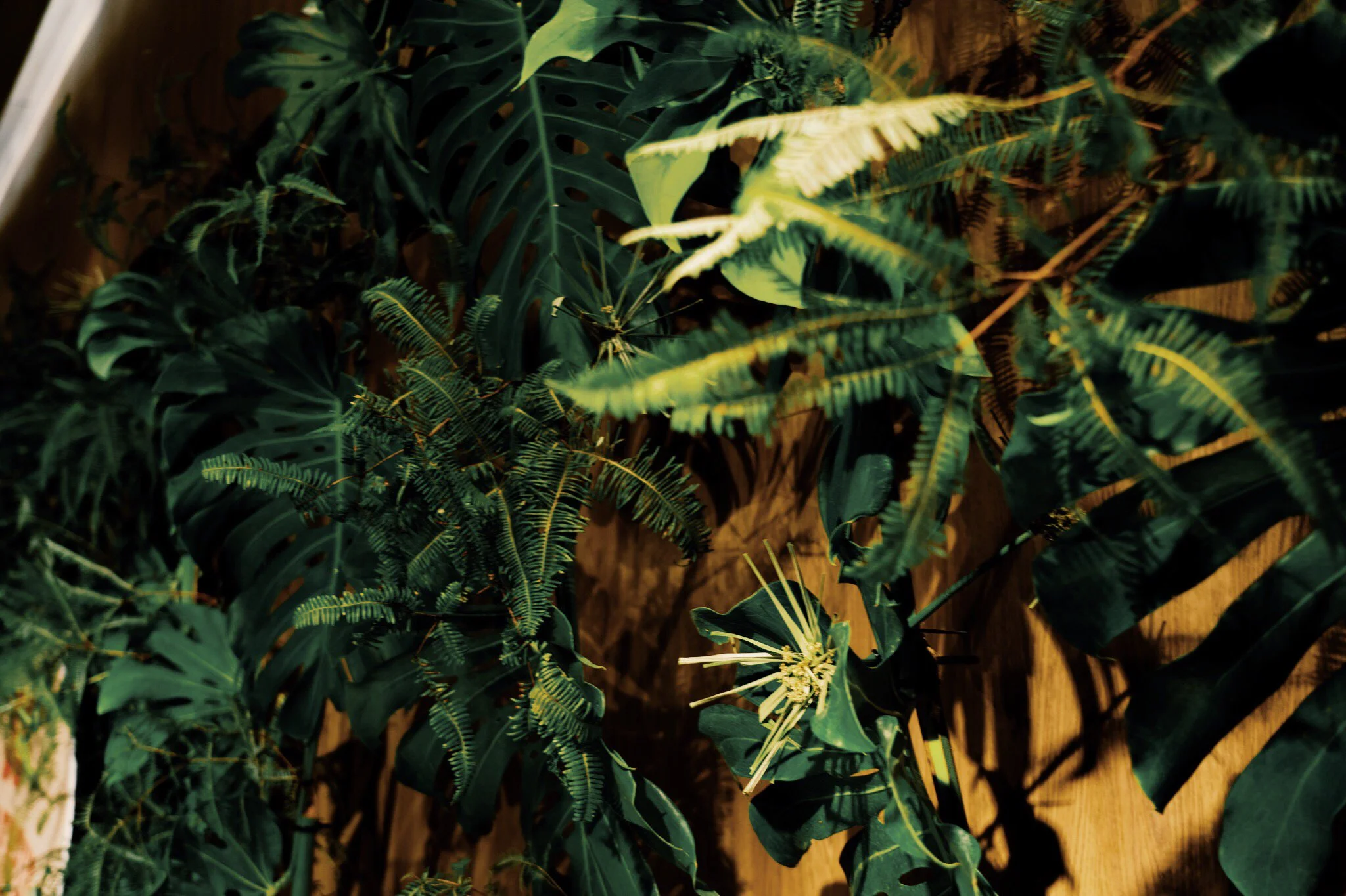結合景觀植栽設計專業,選用龜背芋、芒萁、輪傘莎草三種親水性的綠葉植栽進行現場剪枝插飾,創造有機自然秩序的植物裝置,在一個晚上中打造綿延數十米的海島綠意風景。