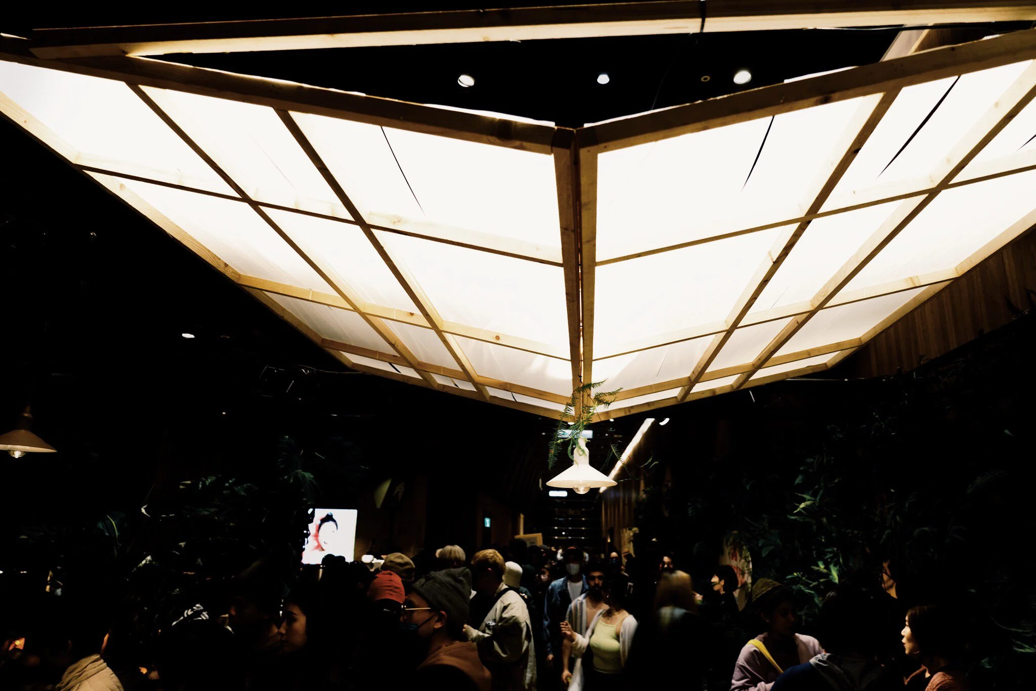 以和式紙門在空間中與燈光產生的通透性為靈感,在廊道的中央位置,以飄浮的門扉打造仰看禪意的意象,讓音樂現場跨越樂種的 Good Vide,以實質的空間感留在樂迷心中。