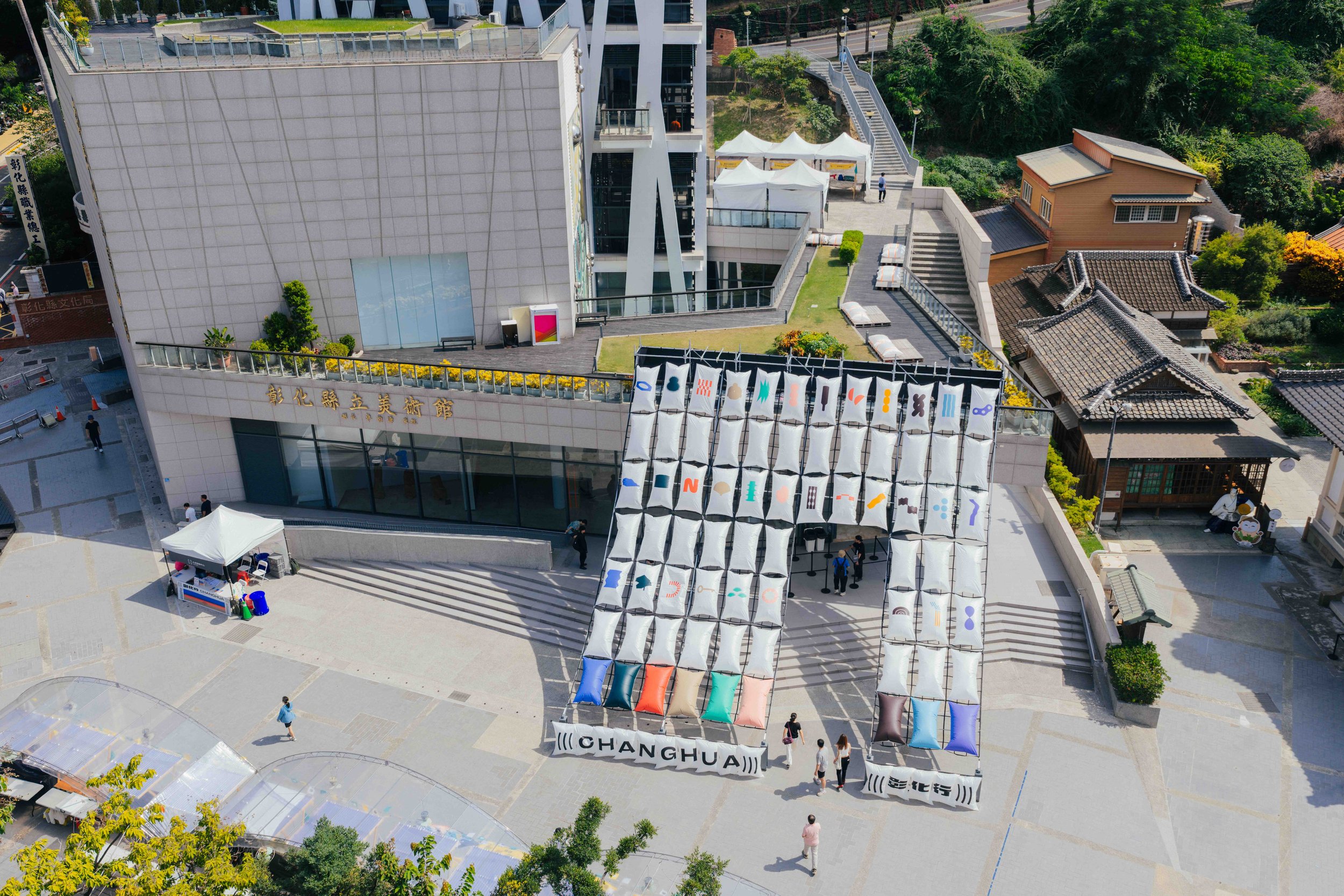 彰化擁有多元且精密的製造能量,這些優良產出皆仰賴貨櫃運輸與緩衝包材的物理保護。作為本次的空間敘事者,我們選擇運輸過程中不可或缺的「緩衝袋」作為核心構築材料。在美術館立面,我們利用彈性布料與緩衝袋創造出一道如布幅掀起的「軟屋簷」,其彎弧曲線建立了現代材質與古蹟武德殿的跨時空對話,並在功能上為來訪者提供了盛日下的遮蔭場域。